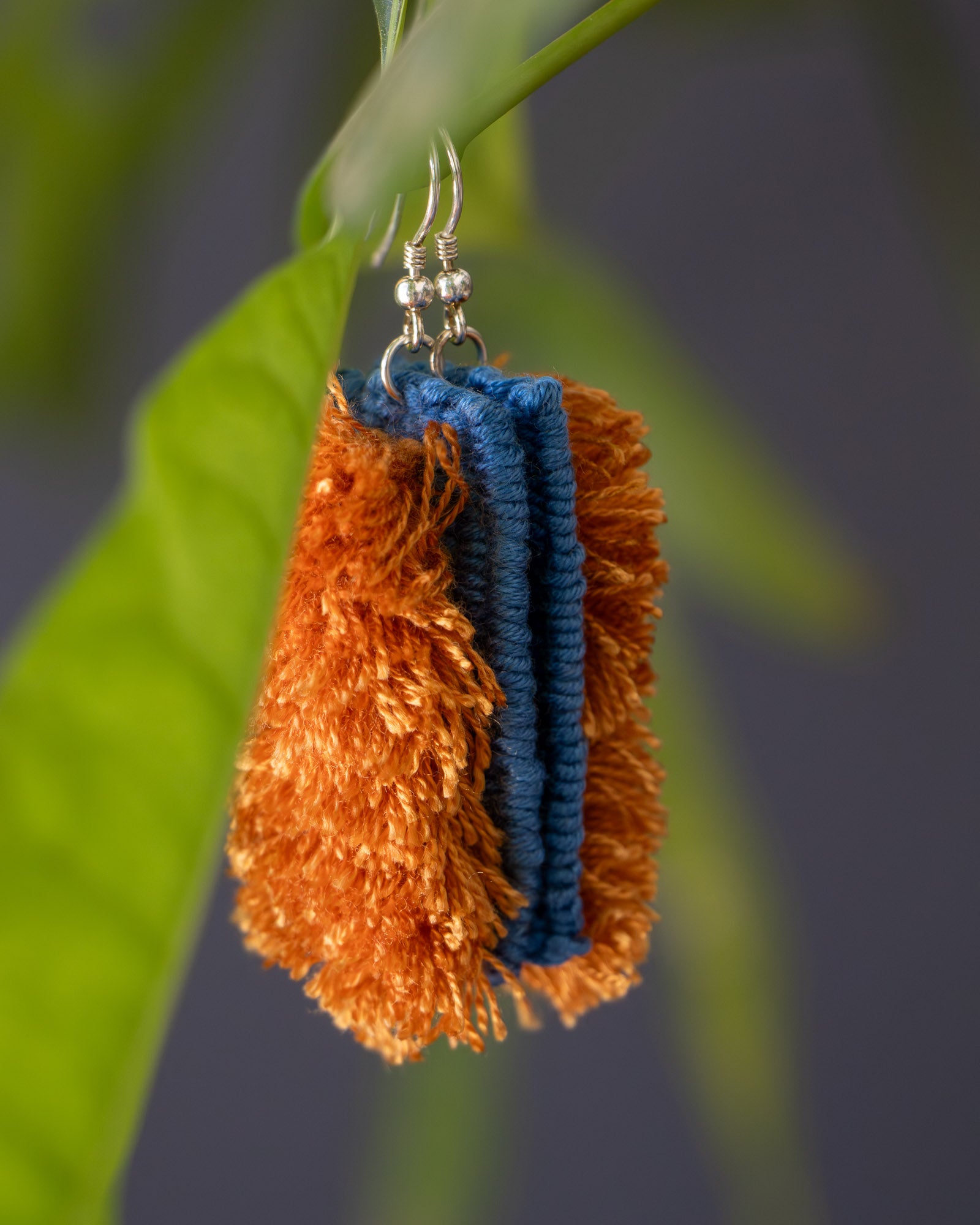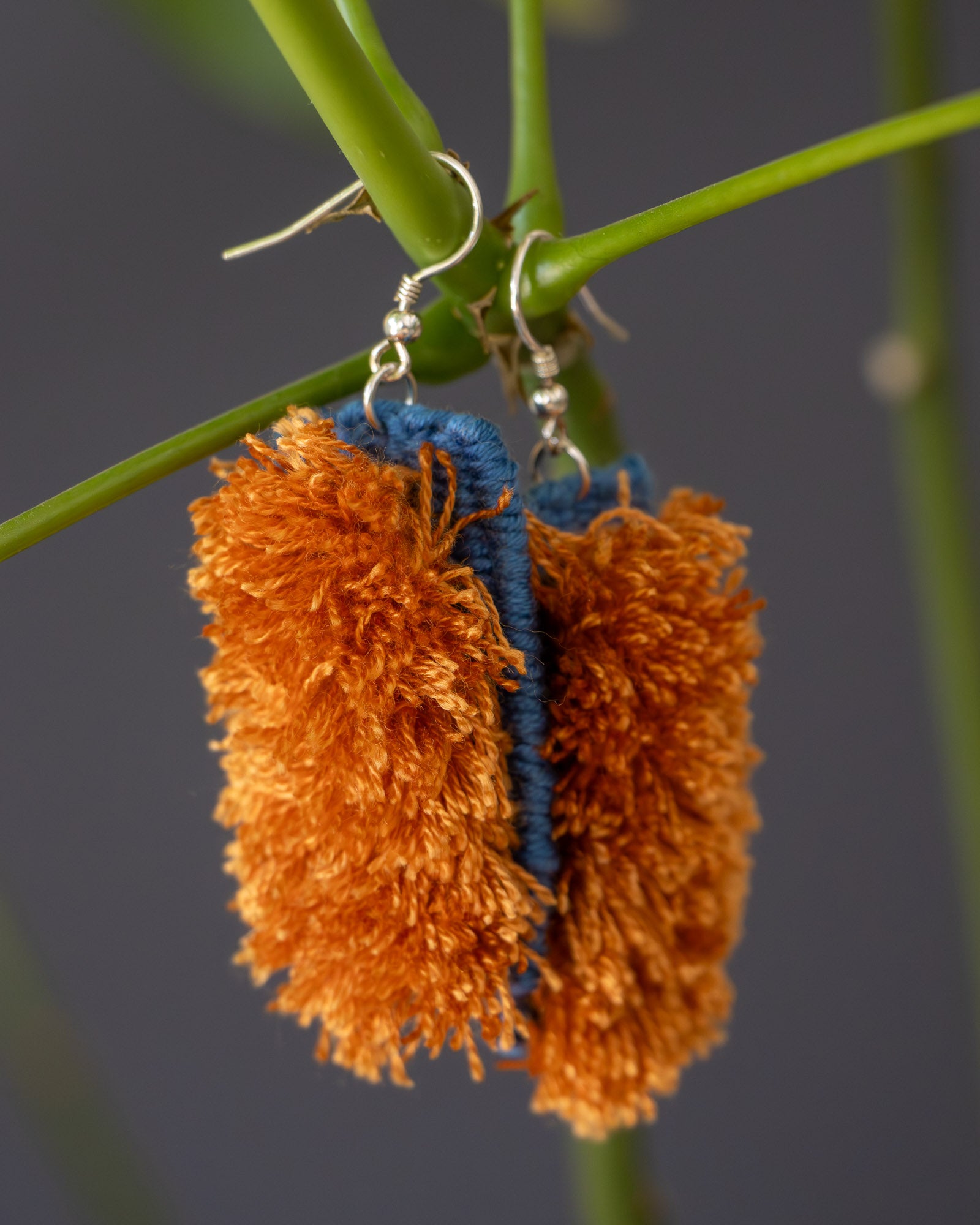 A pair of hand-woven earrings made from cotton and sugarcane fibers and sterling-silver hooks. Light and soft in movement. A small, playful piece of natural texture to wear.